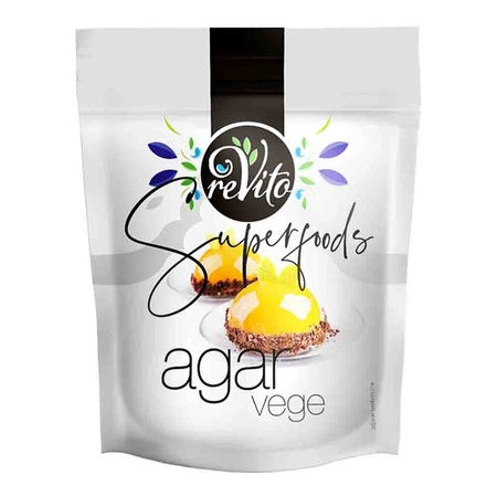ReVito agar е желиращ агент, получен от морски водорасли. Агар, смесен с течност, желира и сгъстява, което намира приложение при производството на зеленчукови желета, пудинги и десерти. Най-добрата веганска алтернатива на животинския желатин. Агар е без вкус и мирис и е лесен за употреба. Основната му съставка е галактоза - сложна захар, която не се усвоява от хората. Чудесно за добавяне към кремове, сгъстяване на супи и като основа за плодови желета. Не е необходимо агарът да се охлажда в хладилника, тъй като той вече се желира при стайна температура.