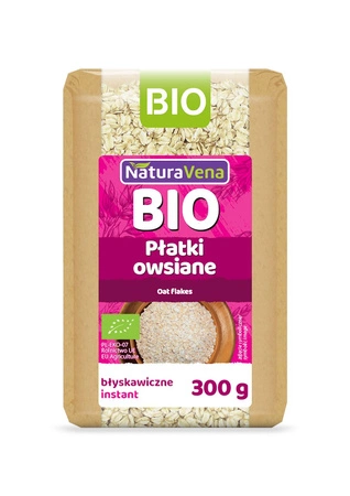 Продукт, получен чрез раздробяване на обелени овесени ядки на валяци и подлагане на хидротермална обработка. Инстантните овесени ядки BIO 300 g са висококачествени овесени ядки от контролирано биологично отглеждане. Те са идеални за приготвяне на бързи и здравословни закуски и междинни хранения. Овесените люспи са богати на фибри, протеини и хранителни вещества, които са от съществено значение за здравето и благосъстоянието.