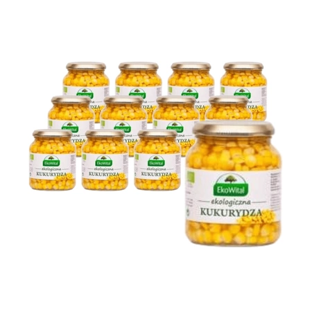 EkoWital разпространява и внася органични и натурални продукти. БИО маринована царевица в буркан. Царевицата е ценен източник на нишесте, протеини, витамини и минерали. Царевицата по природа не съдържа глутен. Освен това съдържа резистентно нишесте, което има благоприятен ефект върху регулацията на храносмилателния тракт. Бурканът е безопасна опаковка - неговите микроелементи не проникват в храната. След като се изпразни, може да се използва повторно. Царевицата в буркан е с по-ниско съдържание на сол в сравнение с подобни консервирани продукти.
