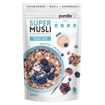 Purella Superfoods е пълна с ценни съставки за поддържане на здравето. Supermusli е комбинация от мюсли и суперхрани. Supermusli Concentration е комбинация от различни пълнозърнести плодови люспи и суперхрани: сурово какао, черница и маца. Корен от мака на прах увеличава издръжливостта, намалява умората и подпомага мозъчната функция. Плодовете на черницата повишават енергията и подобряват когнитивните функции. Какаото е отличен антидепресант - източник на лесно усвояеми магнезий, желязо, калций и фосфор. Елиминира последиците от стреса, подобрява функционирането на нервната система и поддържа нормални психологически функции.