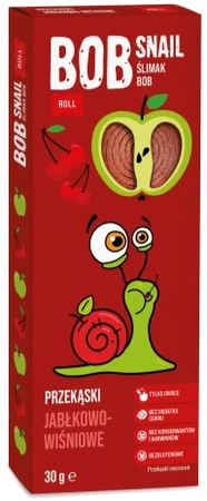 Bob Snail ябълка и череша са натурални плодови закуски от производителя Eco-Snack. Приготвени са от плодове и нищо друго! В продуктите на Bob Snail няма консерванти, оцветители или добавена захар. Продуктите на Snail Bob са подходящи за вегани. Закуската с ябълки и череши се състои от 100% ябълки и череши. Ябълките са източник на ценни фибри, които подобряват работата на храносмилателния тракт. Стимулира чревната перисталтика и предотвратява рак на дебелото черво. Освен това ябълките съдържат урсолова киселина, минерали (калий, магнезий, желязо, силиций и калций), кверцетин, а семената - витамин В17. Червеният цвят на черешите се дължи на антоцианините - пигменти с антиоксидантни свойства. Тези вещества предпазват организма от рак, като премахват свободните кислородни радикали.