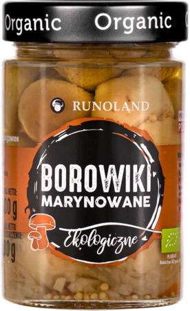 borowiki* (Boletus edulis) 60%, woda, ocet*, cukier trzcinowy*, cebula*, sól, marchew*, przyprawy* (w tym GORCZYCA), regulator kwasowości: kwas cytrynowy (*certyfikowany składnik ekologiczny)